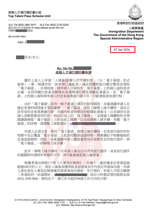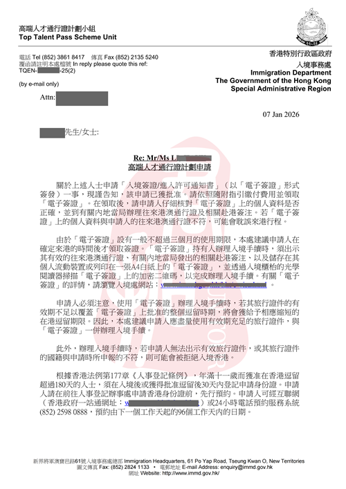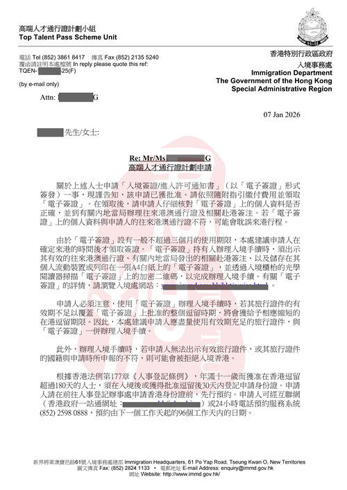 本次获批客户为企业资深高管,收入构成为基本工资+年度一次性分红,两项应税收入合计达到香港高才通A类要求的250万港币标准。客户于2025年9月26日正式递交高才通A类申请,期间因收入证明的细节规范性问题收到香港入境处补件通知,在君拓移民专业团队的精准指导下,快速完善并提交补件材料,最终于2026年1月7日成功获取获批信!