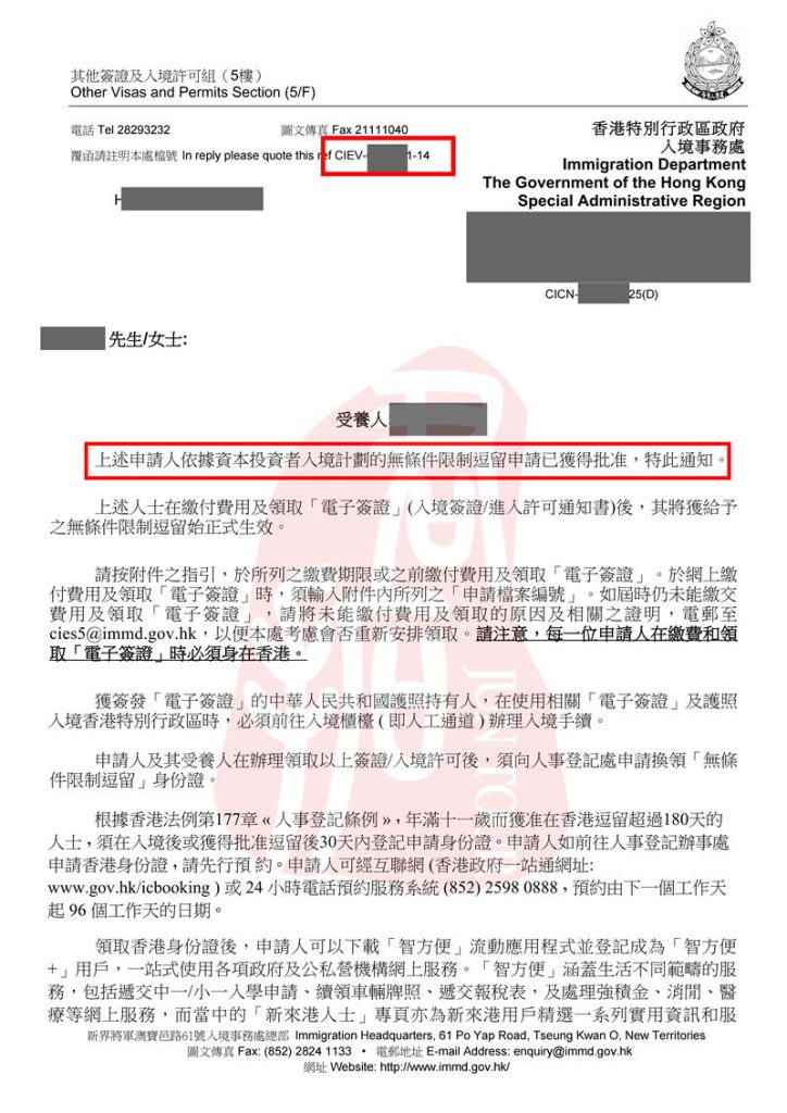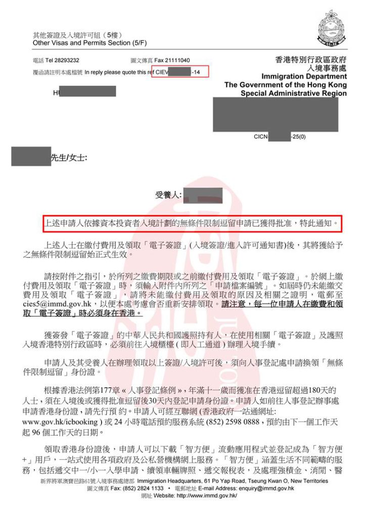 香港投资移民(旧政)客户全家转无条件签证获批信