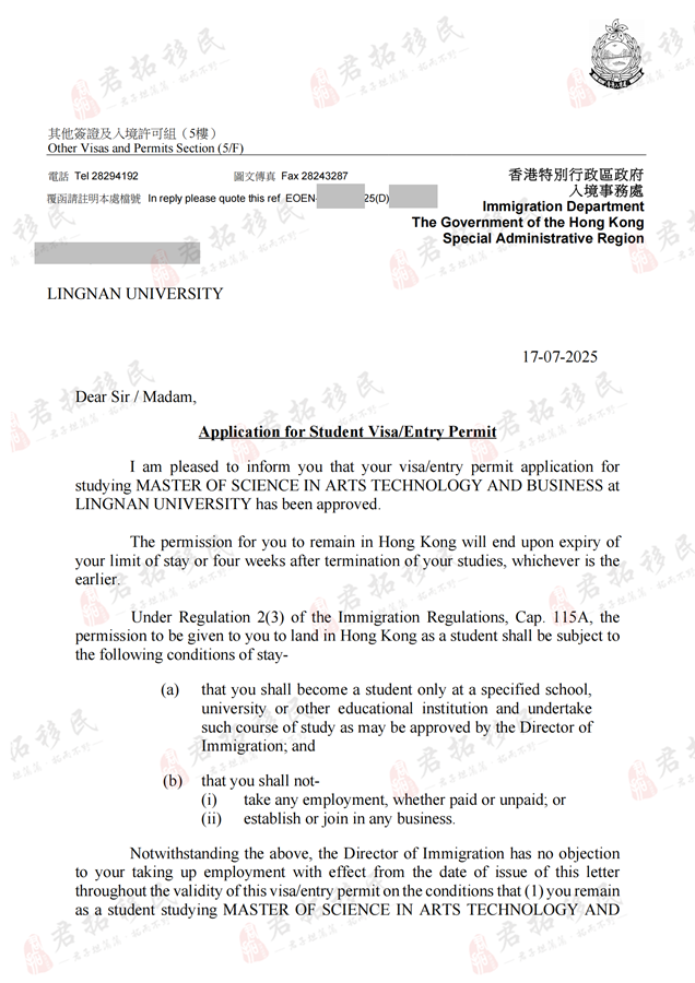 通过君拓的专业指导,W先生不仅成功获得香港岭南大学硕士录取,还顺利办理了学生签证,为其在香港的学习和未来职业发展奠定了坚实基础。
