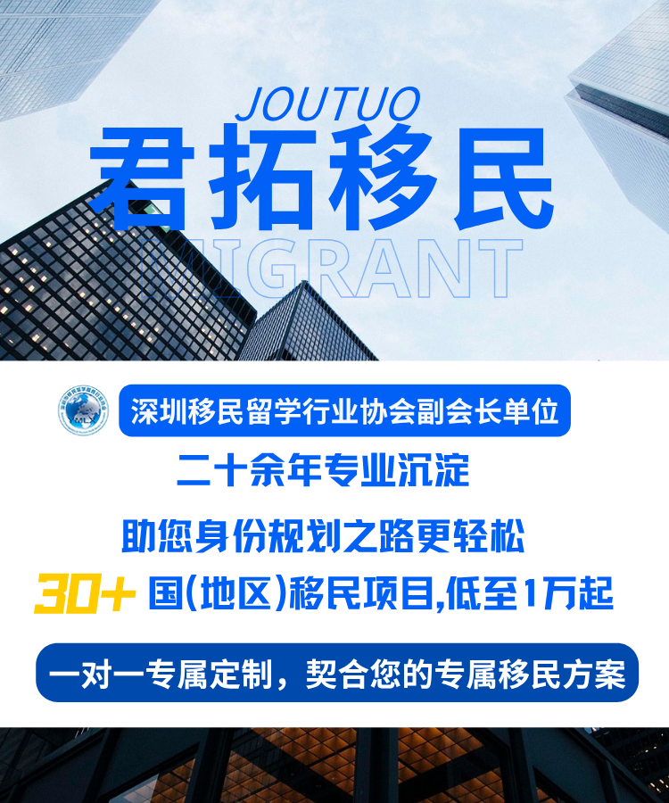 君拓移民咨询服务有限公司,作为深圳移民留学行业协会副会长单位,拥有20余年专业经验,致力于为客户提供全球30+国家(地区)的移民与留学服务。最低1万元起,涵盖投资移民、技术移民、留学移民等多种项目,君拓为您量身定制专属身份规划方案,助您轻松实现全球生活梦想! 立即拨打咨询热线:400-004-5801(我帮您移),或访问官网:www.ym5801.com。